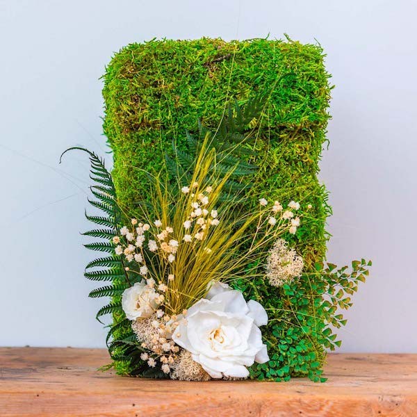 Urne biodégradable pour dispersion des cendres, dépôt en mer ou inhumation en pleine terre (selon certaines conditions) ou dans un cimetière écologique (mais pas dans un cimetière classique).Caractéristiques : Dimensions : 18 x 18 x 27 cm (L x l x H) Contenance : 4,20 litres Poids : environ 800 g Matériaux : carton ondulé, végétaux stabilisés Fleurs et végétaux principaux : gardénia, lichen, gypsophile, fougère lutti, fougère parchemin, bouton de rose, mousse Sac hydrosoluble écologique inclus pour le recueil des cendres Etiquette d’identité incluse Sac de transport en kraft brun luxe avec poignées en cordelette